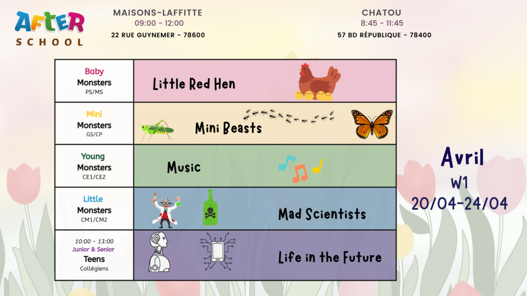 Les vacances de printemps approchent… Offrez à vos enfants deux semaines ludiques et enrichissantes à After School, pour profiter pleinement de cette pause scolaire !