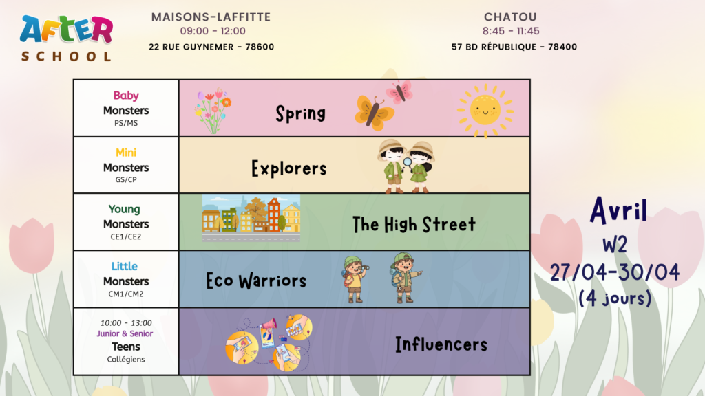 We are offering a special camp for children and teenagers (ages 3–16) at our After School centers in Chatou and Maisons-Laffitte.